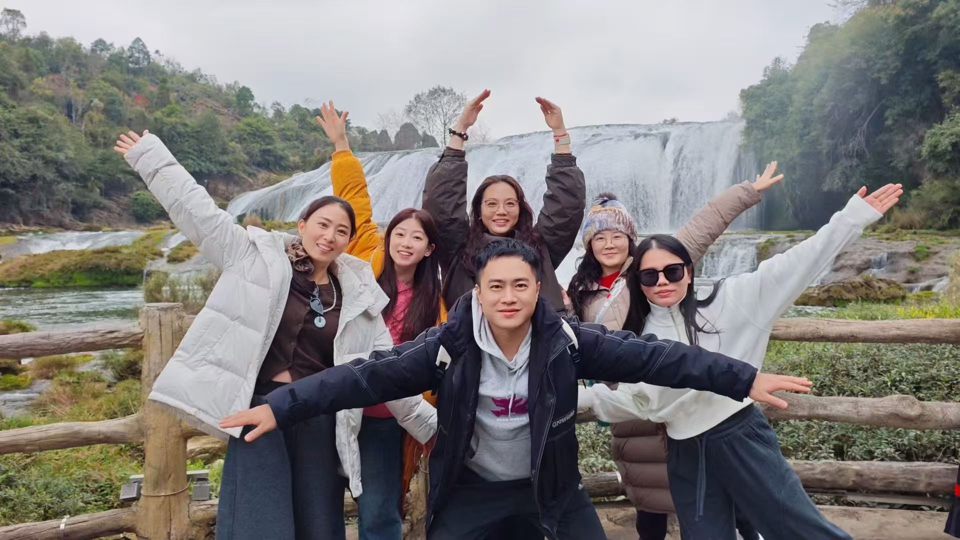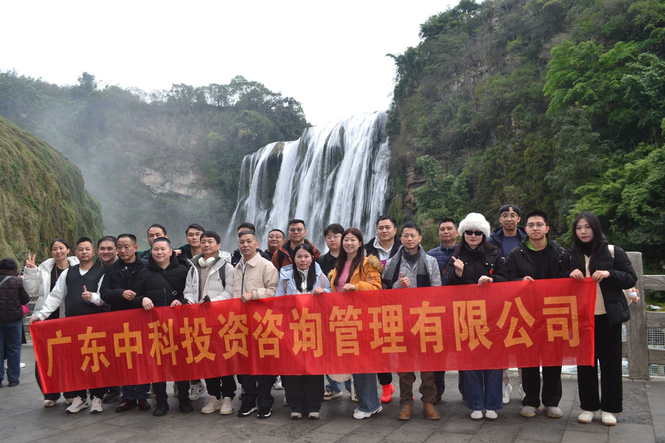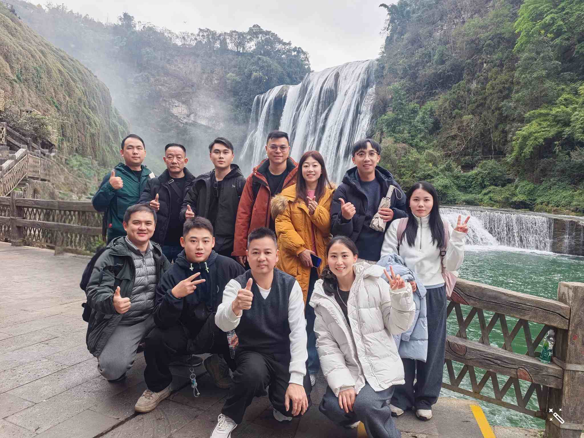次日,大家来到举世闻名的黄果树瀑布。虽值冬季,瀑布依然气势磅礴,水声如雷,水雾弥漫。站在观景台上,大家被这自然奇观深深震撼,纷纷拿起相机记录下这壮丽的一刻。